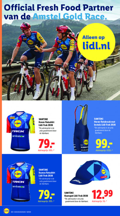 Deze tekst wordt automatisch gegenereerd, dus deze kan fouten bevatten.Official Fresh Food Partner a TI van de N ER m eo à ES Alleen op R ay es. d pe À 7 Kms © lidl.nl <= É À { fe Le del A hm VERS u sery;, rm ER J i \ } \ l Ke F à ij É 1 / ä a ) df SA) | SANTINI SANTINI N Heren fietsshirt Heren fietsbroek met € U PL Dt Lidl-Trek 2026 “De adviesprijs is de. DEC TOUS TREI< prijs geadviseerd door geadviseerd door de de fabrikant. fabrikant. servicenaw. en La 19: TRE 99- Adviesprijs a eg = wevicen] Adviesprijs: €125.-* AM EU CT ni Dames fietsshirt « Lidl-Trek 2026 PA zen *De adviesprijs is de be { I] TREK prüjs geadviseerd door de fabrikant. ETC ET SANTINI EE Koerspei -Trek 2026 12.99 “De adviesprijs isde prijs == Adviesprijs: €95. geadviseerd door de fabrikant. Adviesprijs: 18.* IKB