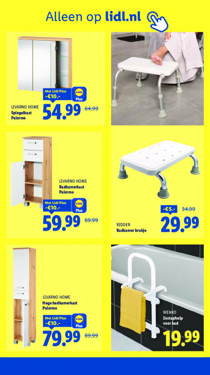 Deze tekst wordt automatisch gegenereerd, dus deze kan fouten bevatten.— Alleen op lidl.nl Ss |] €10 A ci zen 54,99 > PL lkamerka L. è €10 Plus 59.99 «> 29 99 M eg Hoge badkamerkast €10 | 79 gj en 19 ek)