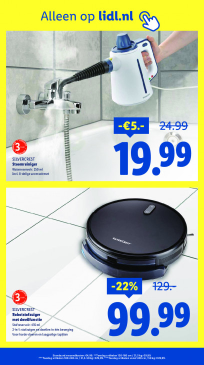 Deze tekst wordt automatisch gegenereerd, dus deze kan fouten bevatten.Alleen op lidl.nl N Sn è | L 44 5 Ô 5 pe = mn) ge an | d 4 = NUS SILVERCREST Stoomreiniger VLLLLKLKKLLLEN! 99 Waterreservoir: 250 ml Incl. 8-delige accessoireset A LE 19 LE oe, | -22% 12 cn SILVERCREST Robotstofzuiger met dweilfunctie Stofreservoir: 435 ml Z:in-1: stofzuigen er dweilen în één beweging Voor harde vloeren en laagpolige tapijten 99,99 standaard verzendkosten: €4,99. **Toeslag artikelen 120-180 em / 31,5 kg: €9,9. AEC ORTE ERK NCN gartikelen vanaf 240 cm / 50 kg: €49,99.