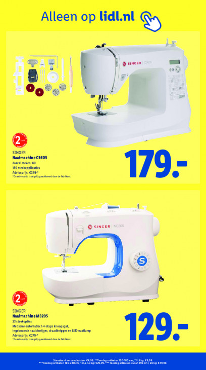 Deze tekst wordt automatisch gegenereerd, dus deze kan fouten bevatten.Alleen op lidl.nl QG € G SINGER ö Q 66 ÿ zi 5 % a D cn 2: vd SINGER Naaimachine C5605 Aantal steken: 80 180 steekapplicaties Adviesprijs: €349-* “Deadviesprijs is de prijs geadviseerd door de fabrikant. 179 l ) SINGER Kd oc ne SINGER Naaimachine M3205 23 steekopties Met semi-automatisch 4-staps knoopsgat, ingebouwde naaldinrijger, draadknipper en LED-naailamp Adviesprijs: €279-* “Deadviesprijs is de prijs geadviseerd door de fabrikant. 129 Standaard verzendkosten: €4,99, **Toeslag artikelen 120-180 cm / 31,5 kg: €9,99. EERE TETE NEETER EVE TER