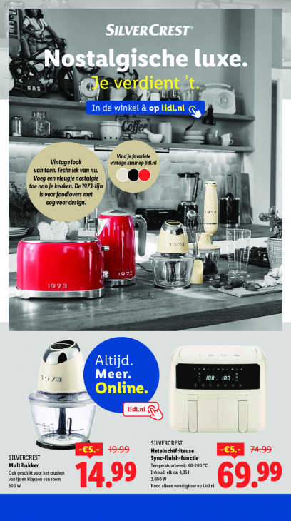 Deze tekst wordt automatisch gegenereerd, dus deze kan fouten bevatten.p HS N y L 5 dient t î = ER TRUE Pa D mn en Bl | 2 Vind je favoriete = Vintage look vintage ‘kleur op lidl.nl "7 en. Techniek van nu. Voeg een vleugje nostalgie ee iu toe aan je keuken. De 1973-lijn is voor foodlovers met mn en oog voor design. een 373 | ET a di il | l Ù dl en oil Kel f > 19 me 4 a er ee EU pes = Ce 1) Zu 180 ı80 Online. LT en = US U re SILVERCREST Heteluchtfriteuse SILVERCREST Sync-finish-functie Ei] + Multihakker Temperatuurbereik: 60-200 °C Ook geschikt voor het crushen Inhoud: elk ca. 4,35 L van js en kloppen van room 2.600W 99 500W 1499 Rood alleen verkrijgbaar op LidLnl 6