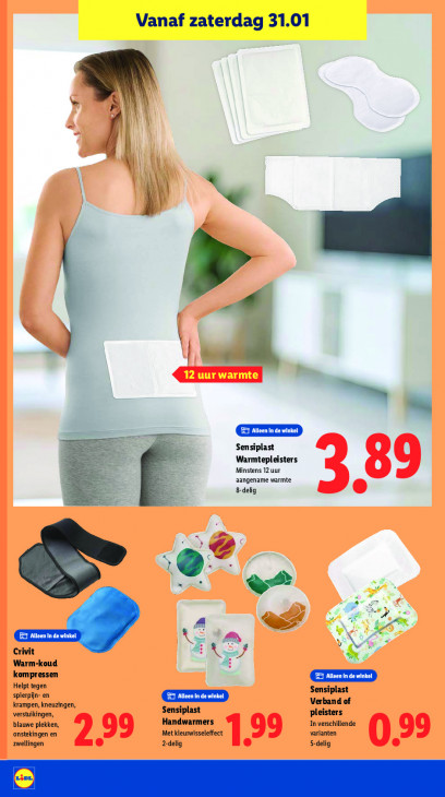 Deze tekst wordt automatisch gegenereerd, dus deze kan fouten bevatten.Vanaf zaterdag 31.01 \\ N | . > vi à DL Sensiplast Warmtepleisters Minstens 12 uur aangename warmte 8-delig ct :@ w = 7 Mi LOL x f & à RL Crivit KA ER Warm-koud # À kompressen Helpt tegen Sensiplast spierpijn- en Verband of krampen, kneuzingen, verstuikingen, Sensiplast pleisters blauwe plekken, Handwarmers In verschillende Met kleurwisseleffect varianten onstekingen en zwellingen 2-delig 5-delig Ea