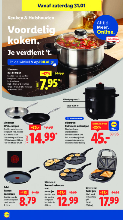 Deze tekst wordt automatisch gegenereerd, dus deze kan fouten bevatten.| Vanaf zaterdag 31.01 2% A 2 a Alt 1] Meer Online. 22 = - = on [@; EN ZI DE CAT 0,1 EE 1 I de winkel & oplidl.nl SO‘ DICH RVS kookpan Geschikt voor alle soorten [17% BE kookplaten -incl. inductie In de varianten 9 20 x 10 cm of © 24 x T1 cm 20 x 10 cm. © 24 x 11cm van CHA Pe URL 16 kookprogramma's, 0030 1000-1200 W Silvercrest Silvercrest RVS koekenpan Elektrische snelkookpan Geschikt voor alle soorten Timerfunctie voor Plus kookplaten - incl inductie uitgesteld koken 9 24cm of 928 cm Inhoud maatbeker: 5,7 L *RVS koekenpan © 24 cm. Incl. maatbeker, röstlepel, RVS koekenpan © 28 cm soeplepel, stoominzeten van €24-99 voor €16.99 siliconen dekselafdichting = |: ) N 7 NN Ex Silvercrest Tefal Pannenkoekenpan met Silvercrest Pannen- vormpjes Tosti-ijzer 3-in-1: sand- koekenpan Geschikt voor Geschikt voor alle alle soorten wich/wafels/ soorten kookplaten kookplaten - grill - exel.inductie incl. inductie 750 W 925cm 926 cm PFAS-vrij