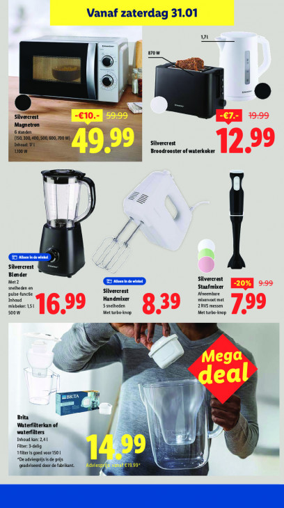 Deze tekst wordt automatisch gegenereerd, dus deze kan fouten bevatten.Vanaf zaterdag 31.01 1 Dm 870W as = se : —— À om AL ilvercrest Magnetron 6 standen _50,300,400,500 600,700). : Silvercrest Broodrooster of waterkoker in I SS je al ee + Silvercrest Dn Blender Silvercrest Met 2 snelheden en Staafmixer Silvercrest Afneembare pulse-functie Inhoud Handmixer mixervoet met mixbeker: 1,5 1 5 snelheden 2RVS messen 500W Met turbo-knop Met turbo-knop er =. ‘M Brita ni N Waterfilterkan of waterfilters Inhoud kar ‚AL Filter: 3-delig er 1filter is goed voor150 | | *De adviesprijsisde prijs geadviseerd door de fabrikant. €19.99*