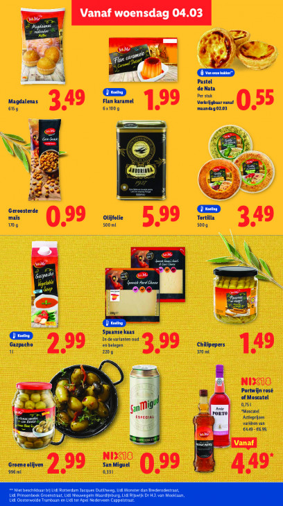 Deze tekst wordt automatisch gegenereerd, dus deze kan fouten bevatten.Vanaf woensdag 04.03 (la 7 — wa ds. Pr Fi Le (Os » se nm y r Pastel de Nata Per stuk Magdalenas Flan karamel Verkrijgbaar vanaf 615g 6x100g maandag 02.03 es (ET En 2 WE un D pd Et ne no À CE Geroosterde maïs Olijfolie Tortilla 1709 500 ml 500g Kl (212 2 de RL AT ee ms + = A Spaanse kaas In de varianten oud. Gazpacho en belegen Chilipepers 1 209 370 ml A Sn | | M Portwijn rosé (1 = of Moscatel 7 [ES mig 0,751 $ *Moscatel Es, Actieprijzen variëren van u €449-€6.99. x I Tes Groene olijven San Miguel 996 ml 0,331 PSS