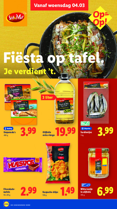 Deze tekst wordt automatisch gegenereerd, dus deze kan fouten bevatten.Vanaf woensdag 04.03 eg % A a ee Fie > + ré +. mon _— ob = GEL 1 Empanada's Olijfolie Sardientjes 450 g extra vierge LT mg Eu NALOR) = (12 i UE Í > en Chocolade- Wittetonijn wafels Gazpacho chips KK CU 10x20g 1509 45g