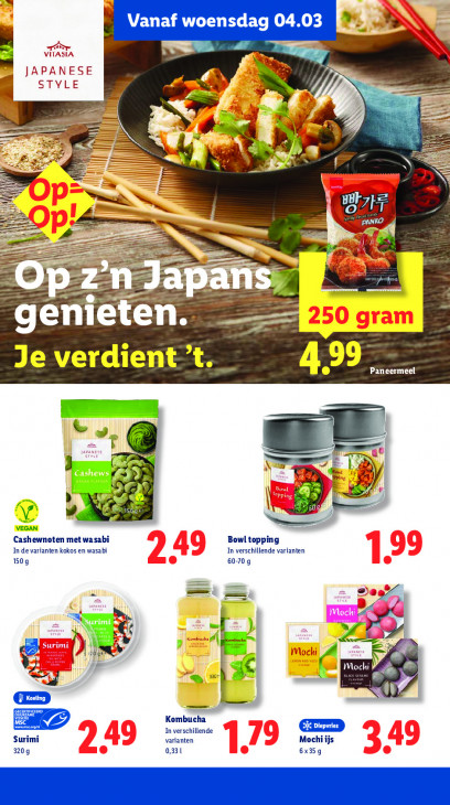 Deze tekst wordt automatisch gegenereerd, dus deze kan fouten bevatten.Vanaf woensdag 04.03 a, dr VITASIA 4 7 JAPAN NESE STYLE > Fe u Or; — => rd + LA Fr 1 = el. ma _— m = = nd ge EF AE e verdient t. Paneermeel to a Ns ef hews 9 P WL Rd Di VEGAN Cashewnoten met wasabi Bowl topping In de varianten kokos en wasabi ‘In verschillende varianten 1509 == = 60-709 = 2 Y © a zur “€ Mochi Ven me — Kombucha CC In verschillende Surimi varianten Mochiijs 3209 0,331 6x359