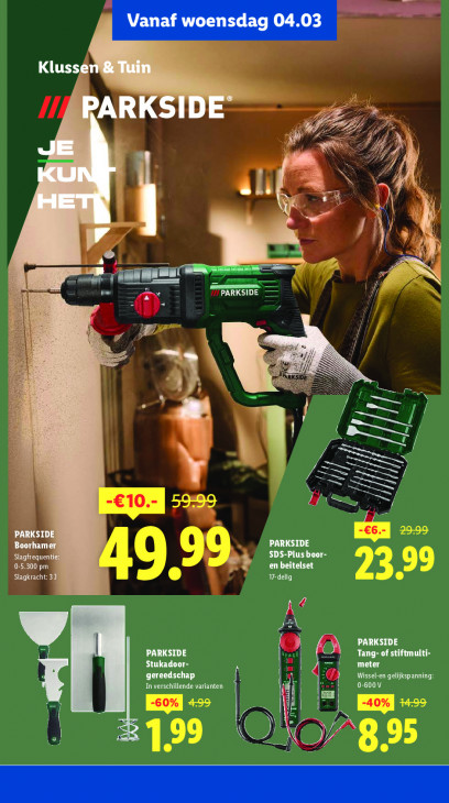 Deze tekst wordt automatisch gegenereerd, dus deze kan fouten bevatten.Klusse PARKSIDE N LA ded 2 U À J ae N 4: ee (LLL ste ne 2 + 1 PARKSIDE = ES B, | N ZI Bi — 1} 7 III BR PARKSIDE Boorhamer PARKSIDE EE pr} SDS-Plus boor- 0-5.300 pm Slagkracht: 3] a" 17-delig CETTE di A N d PARKSIDE Stukadoor- PARKSIDE fi meter Tang- of stiftmulti- gereedschap | Al I = Wissel-en gelijkspanning: In verschillende varianten | 0 1 a C N nl ir © JA