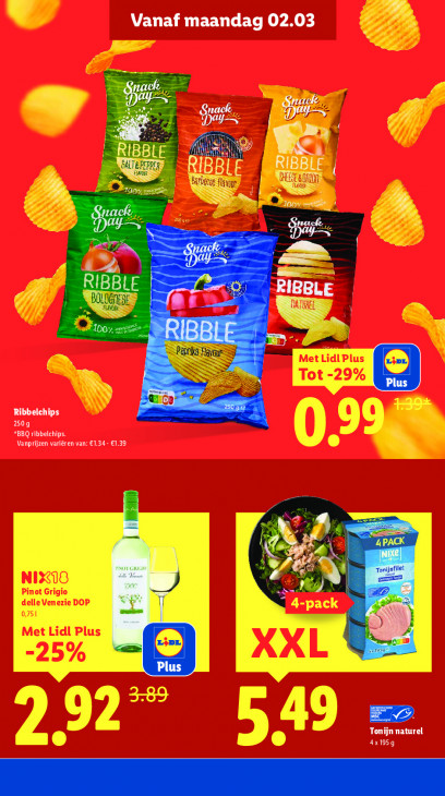 Deze tekst wordt automatisch gegenereerd, dus deze kan fouten bevatten.Vanaf maandag 02.03 GO | De > le RIB £ 22, Nig LE OB Ribbelchips 2509 Bep ren van: €1.34- €1.39 S. 2) Tonijn naturel PCT] nn