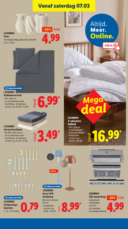 Deze tekst wordt automatisch gegenereerd, dus deze kan fouten bevatten.A se. LIVARNO Vaas Online. = Van hoogwaardig, geglazuurd aardewerk Ca.12 x19 em 499 I LIVARNO Dekbedovertrek *140 x 200 cm In verschillende maten beschikbaar. Actieprijzen variëren van: €6.99- €12.99. 26,99 LIVARNO 4-seizoenen dekbed LIVARNO *140 x200.cm Jersey hoeslaken In verschillende *90-100 x 200 x 20 cm maten beschikbaar In verschillende maten Actieprijzen beschikbaar. Actieprijzen variëren v variëren van: €3,49 - €5,99. 1349 €16.99 - €25.99. (D | —— or ED 3 a 3 9 f E > y mi er 4 LIVARNO Accu-LED- LIVARNO tafellamp LED-sensorlamp LIVARNO Met touch-dimmer Automatische ET: functie uitschakeling Verjaardags- na 30 sec. *Actieprijzen kaarsjes 79 variëren van 99° Incl batterijen 5-,10-, of 13-delig e €8.99 - €15.99. 8 en montage-materiaal 499