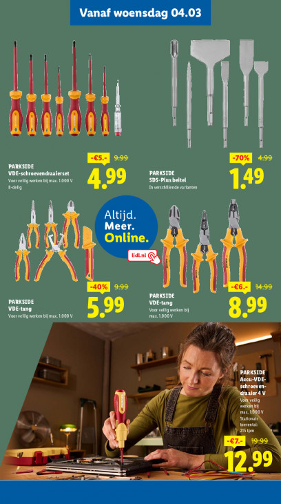 Deze tekst wordt automatisch gegenereerd, dus deze kan fouten bevatten.Vanaf woensdag 04.03 | | | PARKSIDE VDE-schroevendraaierset SDS-Plusbeitel PARKSIDE Voor veilig werken bij max. 1.000 V EPA 99 In verschillende varianten 149 m I) Altijd Meer. Online. | Ri 40% E22 PARKSIDE PARKSIDE VDE-tang VDE-tang 99 Voor veilig werken bij Voor veilig werken bij max. 1.000 V Lan) 99 du m À Is 5 4 | PARKSIDE Accu-VDE A schroeven: ier 4 V A LT RT MO Stationain Eed k | toerental: D A MER re 3 u en De 12.99 ER ef — = ee _ —