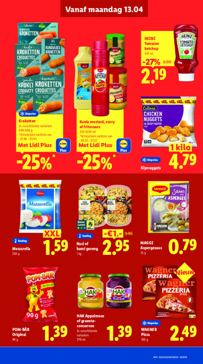 Deze tekst wordt automatisch gegenereerd, dus deze kan fouten bevatten.Vanaf maandag 13.04 I hi : na al | Ca . I LL, 0, DL, 2, CL, a og Pa = Kipnuggets L xl XL rj ir Lt A Bis = 79 À PES Nasi of MAGGI Mozzarella Aspergesaus ER LL bami goreng 359 = Original En L' À, PIZZERIA u? AA à Se. À NO] oe mm) OJ € Dn & YA »”» HAK Appelmoes me se of groente- POM-BÄR conserven Original varianten PURE SSH EUR Pizza WAGNER 90 g 370 ml 365 9 En