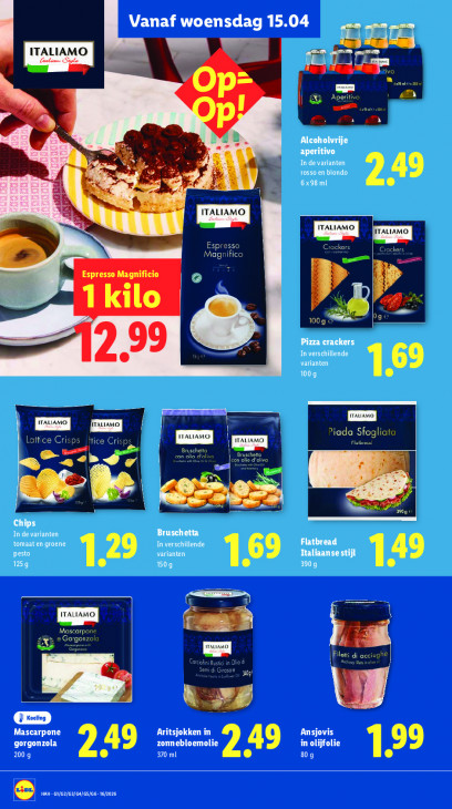 Deze tekst wordt automatisch gegenereerd, dus deze kan fouten bevatten.Vanaf woensdag 15.04 = & J ix En - Er = nt =} =. E Aperitive ” Alcoholvrije aperitivo In de varianten rosso en biondo 6x98 ml 249 Espresso Er N Magnifico © 100g kj Pizza crackers RON rt varianten LE 100g us ! | LR OU] = Piada Sfoglicte Me schaf RS | AR | | EN De CA Chips In de varianten Bruschetta tomaat en groene In verschillende Flatbread EG varianten Italiaanse stijl RE 169 149 LT 150g 3909 m De Cr RE & u =D Mascarpone Aritsjokken in Ansjo! gorgonzola zonnebloemolie in olijfolie LE 370 ml FR} 249 809 1.99 RCA
