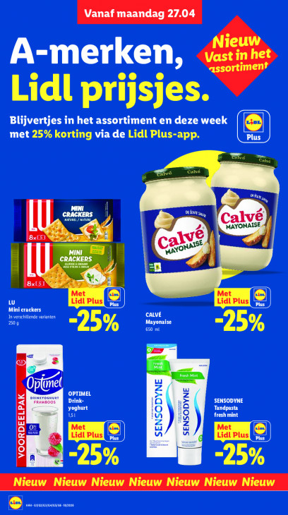 Deze tekst wordt automatisch gegenereerd, dus deze kan fouten bevatten.Vanaf | Vanaf maandag 27.04 27.04 Sn Lidl prijsjes 25% korting Lidl Plus-app. Dies! LE Ël | MAYONAISE CRACKERS he 8x[51 / -25% Zer Der FRAMBOOS Bir VOORDEELPA ey -25%