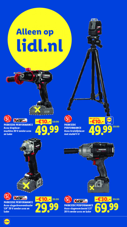 Deze tekst wordt automatisch gegenereerd, dus deze kan fouten bevatten.B Alleen op el «) L Pr lidi.nl 7 j / I ), ED 1 5 1 À N > oc hanche PARKSIDE PERFORMANCE £10 Le ARKSIDE Aceu-kl machine 20 V zonder accu Accu-kruislijnlaser PERFORMANCE en 4959 met statief 4 V 49 99” = | nf Er 1 d = 2 | x ae Pr PARKSIDE PERFORMANCE :£10 1/4" 20 V zonder accu en Accu-slagschroevendraaier Accu-slagmoersleutel 1/2 PARKSIDE PERFORMANCE lader 20 V zonder accu en lader 69,99 ed