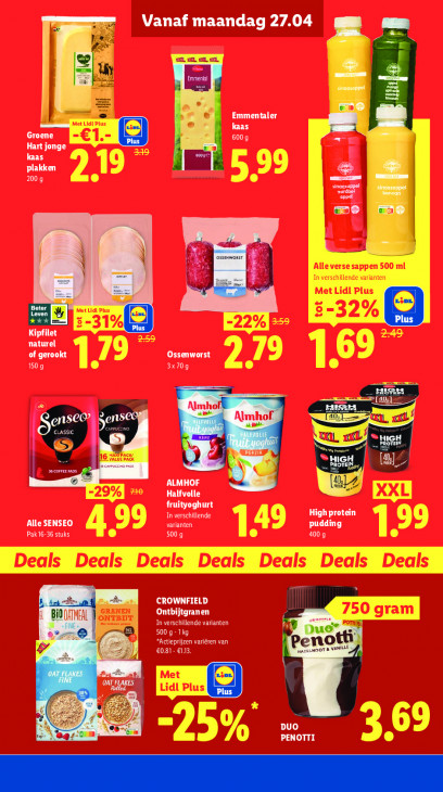 Deze tekst wordt automatisch gegenereerd, dus deze kan fouten bevatten.Tat Vanaf maandag 27.04 Dr ke x Pr = sel PE = Emmentaler aa laas EU „B ne Go] kaas Hart jonge F plakken 200 g mo mE Een | aal Co me 1@ u Kipfilet naturel Ossenworst of gerookt 150 g 3x70g = Almhof! NU OL, fl Almhof. oa sal hd 1 14 ee ALMHOF Halfvolle fruityoghurt In verschillende High protein Alle SENSEO varlanten pudding Pak 16-36 stuks 5009 EUR CROWNFIELD Dur Ontbijtgranen In verschillende varianten 500 g-1kg €0.81- €113. “Actieprijzen variëren van } | 1077723 DUO 0 PENOTTI nn