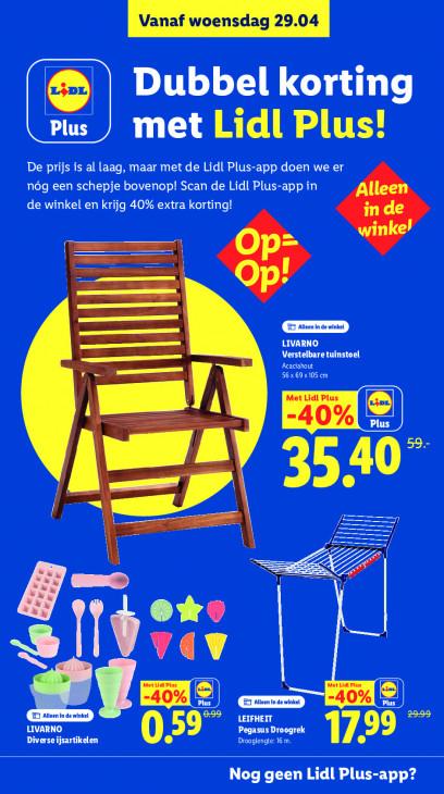 Deze tekst wordt automatisch gegenereerd, dus deze kan fouten bevatten.Vanaf woensdag 29,04 Dubbel korting Plus met Lidl Plus! De prijs is al laag, maar met de Lidl Plus-app doen we er nóg een schepje bovenop! Scan de Lidl Plus-app in de winkel en krijg 40% extra korting! ———— _ Verstelbare tuinstoel LIVARNO Acaciahout 56 x 69 x105 cm 40” mera Ze LS ar y o% VAL » FI Allen kel LEIFHEIT LIVARNO LS Pegasus Droogrek Diverse ijsartikelen DE CON Aa Nog geen Lidl Plus-app?