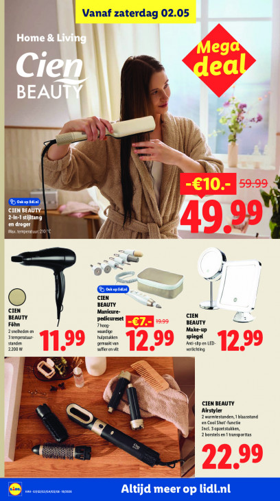 Deze tekst wordt automatisch gegenereerd, dus deze kan fouten bevatten.= Vanaf zaterdag 02.05 5 ap. | N; ù ® LOL CITES] CIEN BEAUTY. 2-in-1 stijltang en droger uf Max. temperatuur: 210 °C © er a er Tyan à CIEN Fr © BEAUTY Le CIEN Manicure- CIEN a BEAUTY pedicureset Fôhn 7hoog- BEAUTY 2 snelheden en waardige Make-up 3 temperatuur- hulpstukken spiegel standen Anti-slip en LED- 2200W saffier en vilt gemaakt van verlichting 7 FR + CIEN BEAUTY Airstyler 2 warmtestanden, 1 blaasstand en Cool Shot-functie Incl. 3 opzetstukken, D. == 2 borstels en 1 transporttas MM RI Altijd meer op lidl.nl