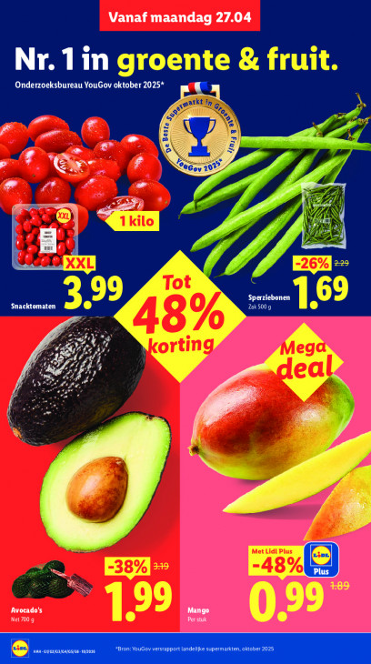 Deze tekst wordt automatisch gegenereerd, dus deze kan fouten bevatten.Vanaf maandag 27.04 Nr. 1 in groente & fruit. Onderzoeksbureau YouGov oktober 2025* 6 ar SL & gn F bin ee Go 292 ae Fa d A 7 % 1 ee ©) N N eID TPS Tot 99 Sperziebonen 1.69 Zak 500 g on 48% Pr) Af Ar AG | orting 4 ega 7 3 e eal LPL -38% kid Avocado's Mango Net 700 g 1,99 Per stuk CE Bron: YouGov versrapport landelijke supermarkten, oktober 2025 a) RT art