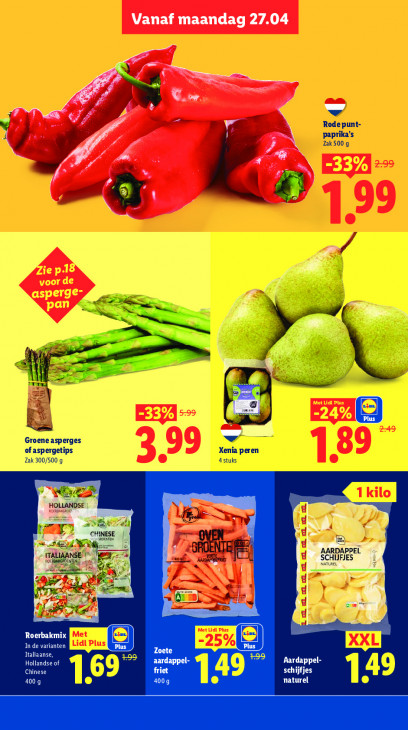 Deze tekst wordt automatisch gegenereerd, dus deze kan fouten bevatten.Vanaf maandag 27.04 LA 2 « Aad » I A 1 rara et Se FORBAOE CE SY are CHINESE ei I AARDAPPEL | Ans . SDE | & | wa te) Pe nr = Te ‘ a ir, Roerbakmix In de varianten Italiaanse, Hollandse of Aardappel- (LEE 49” schijfjes LOUE naturel
