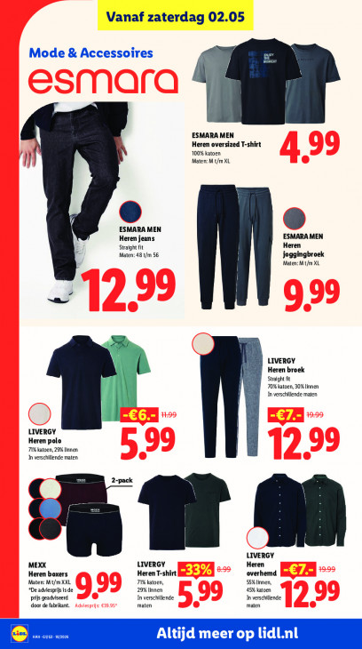 Deze tekst wordt automatisch gegenereerd, dus deze kan fouten bevatten.Vanaf zaterdag 02.05 Mode & Accessoires m ESMARA MEN Heren oversized T-shirt 100% katoen Maten: M t/m XL M 3 ESMARA MEN Heren jeans ESMARA MEN Heren Straight fit Maten: 48 t/m 56 joggingbroek Maten: M t/m XL M LIVERGY Heren broek Straight fit 70% katoen, 30% linnen In verschillende maten LIVERGY Heren polo 71% katoen, 29% linnen In verschillende maten. 2-pack € €. © N LIVERGY MEXX LIVERGY Heren Heren boxers Heren T-shirt overhemd Maten: Mt/mXXL 71% katoen, 55% linnen, “De adviesprijs is de 29% linnen 45% katoen prijs geadviseerd In verschillende In verschillende door de fabrikant. maten maten PNR: 26 Altijd meer op lidl.nl
