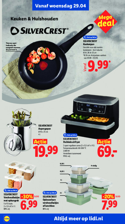 Deze tekst wordt automatisch gegenereerd, dus deze kan fouten bevatten.Vanaf woensdag 29.04 Keuken & Huishouden T° O SILVERCRES x LOI LE SILVERCREST Thermo-spot indicati Koekenpan Geschikt voor alle soorten de panheetis kookplaten - incl inductie N 024,28 en 32cm “0 4 cm. Actieprijzen variëren van €9,99 - €12,99, We "| | £ A Vanaf 9 99: a Su = SILVERCREST Aspergepan 916x 21cm ©, Ook oplidi.nl SILVERCREST Dubbeleairfryer A 2.apart regelbare zones (2x5,5 lof1x111) Temperatuurbereik: 60-200 °C 2.600 W 99 Verstelbare tussenwand 9 e 69- PFAS-vrj sm 0,351 4-delig 0551 u mm — CYR EE SILVERCREST a ze 9:99 SILVERCREST —$ Vershoudbakjes met ophangrek Opbouwbare À 5 of12stuks vershoudbakjes 2x15lof3x1l of lunchbox 99 BPA-vrj 6 e BPA-vrij 799 Altijd meer op lidl.nl ©