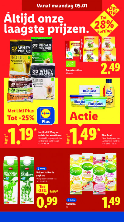 Deze tekst wordt automatisch gegenereerd, dus deze kan fouten bevatten.Vanaf maandag 05.01 Áltijd onze n. laagste prijze natu raf Zonnaturd Le mon d Se 7 Ä | Zonnatura’ Dr Zonnatu rd L TEE |; 1 El — me Sl Zonnatura thee PK EIN N N na EJ sporen BAR B — nz 20. Healthy Fit Whey en protein bar assortiment Blue Band *Healthy Fit vegan protein bar. *Blue Band goede start EMEA EE Actieprijzen variëren €1.19 - €8.99. van €1.49 - €2.39. = md me) Volle of halfvolle WE = yoghurt “Vanprijzen variëren van „de Pad ii €1,38 - €1,18. 2 Le il 7 LS r AN I“ we Campina LL