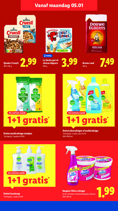 Deze tekst wordt automatisch gegenereerd, dus deze kan fouten bevatten.Vanaf maandag 05.01 Cruesli DO Era EGBER * gie Quirit Cruesli Ip ie ® zn Ve Zus 1 E ten La Vache qui rit Aroma rood Quaker Cruesli cheese dippers 400-450 9 PR 500 g m LE ae Dd CEE Er Dettol allesreiniger of multireiniger Dettol multireiniger doekjes “Actieprijs: 2 stuks voor €3.79 “Actieprijs: 2 pakken €5.89 DIENTEN en en = ==) Alle combinaties mogelijk Magical Shinereiniger Dettol handzeep In de varianten schoonmaakspray of pasta “Actieprijs: 2stuks €3,49 EE
