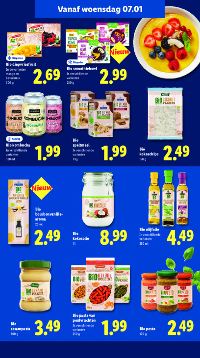Deze tekst wordt automatisch gegenereerd, dus deze kan fouten bevatten.Vanaf woensdag 07.01 ss mai Bn ait en 9 4 LE LC NL Pete go Zen 7 a Dai jeu Diepvries Dn h% Die LEEK COUT In de varianten Bio smoothiebowl mango en In verschillende CRU varianten 300 9 VIS ET EL CONUI zu FLAKES I à SAT EN neon, rou 6 KOMBUCHA à + A r Bio Bio en speltmeel In verschillende In verschillende Bio varianten varianten kokoschips 49 330 ml 199 119 199 150 g [E) L— —% 5 BOU NVA ARONA ve Bio (OK QUE 99 LU bourbonvanille- & = aroma PO Me | LEEK DL Li) BUNT RUNTER nn varianten 49 vEt 899 250 ml 0m o (= 303 BiD nen um À Be reine oh mn WE) BD SES A" BIOPESTO &2 Aue aus @ a% 4 2509 Bio pasta van LAT Bio In verschillende sesampasta varianten Bio pesto 300 9 co ET 1.29 190g 249