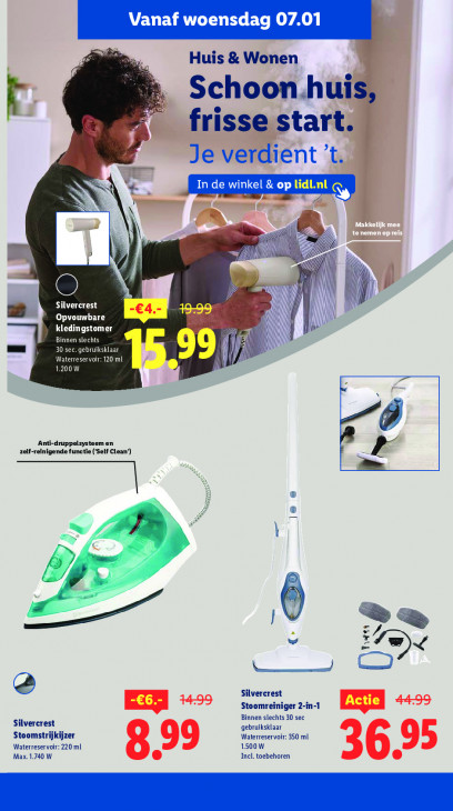 Deze tekst wordt automatisch gegenereerd, dus deze kan fouten bevatten.Vanaf woensdag 07.01 Huis & Wonen ar Schoon hui: E 1 tart. ev ent t É In de winkel & = di \ Makkelijk mee \ CRC n I 9 m | N I! N Silvercrest Opvouwbare kledingstomer I mi 00 Es eit-remigende une sel Clean) ne È > 14 Sj Ÿ Ÿ NS Ÿ heet A ® ne Silvercrest KIA + Binnen slechts 30 sec Stoomreiniger 2-in-1 #0 Silvercrest gebruiksklaar Stoomstrijkijzer Waterreservoir: 220 ml 99 1.500 W Waterreservoir: 350 ml 95 5 Max. 1.740 W Incl. toebehoren D 6 ©