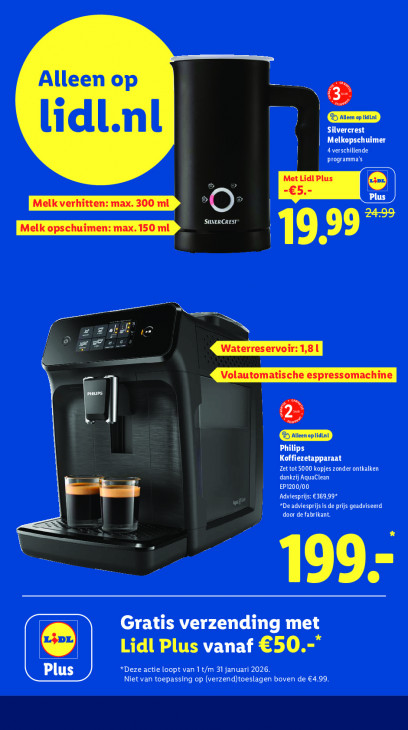 Deze tekst wordt automatisch gegenereerd, dus deze kan fouten bevatten.Alleen op Ni lidi.nl NG Melkopschuimer PRE EEE © "Meikverhiten: max. 00m GO SILVERCREST | CITES = 5. LL as Ce a ee pups == Philips Koffiezetapparaat Zet tot 5000 kopjes zonder ontkalken == ETAT CO | EP1200/00 | ERMEE OAT | “De adviesprijs is de prijs geadviseerd door de fabrikant. MR Gratis verzending met Lidl Plus vanaf €50.-* *Deze actie loopt van 1 t/m 31 januari 2026. A Niet van toepassing op (verzend)toeslagen boven de €4,99.