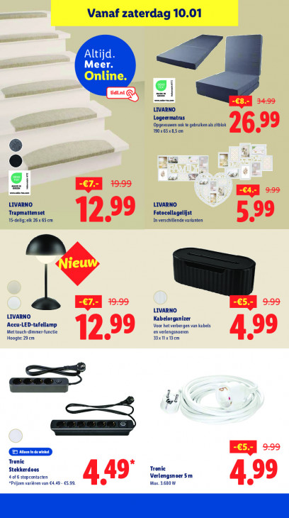 Deze tekst wordt automatisch gegenereerd, dus deze kan fouten bevatten.os ci past Altijd. weed Meer. — li nl mien En LIVARNO Logeermatras Opgevouwen ook te gebruiken als zitblok gee 190 x 65 x8,5 cm 6.99 w Eu x Pre A a £a £a À EI >» ee >> LIVARNO LIVARNO Trapmattenset 99 Fotocollagelijst 15-delig; elk 26 x 65 cm ‘In verschillende varianten 7 599 EZ» LIVARNO LIVARNO Kabelorganizer Accu-LED-tafellamp Voor het verbergen van kabels Met touch-dimmer-functie 99 en verlengsnoeren 33x11x13cm 499 Hoogte: 29 cm 5 I e= N Tronic Tronic Stekkerdoos 4 of 6 stopcontacten Verlengsnoer 5m *Prijzen variëren van €4,49 - €5,99. 449 Max. 3.680 W 499