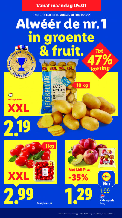 Deze tekst wordt automatisch gegenereerd, dus deze kan fouten bevatten.Vanaf maandag 05.01 ONDERZOEKSBUREAU YOUGOV OKTOBER 2025 Alwéér de nr. in groente a! & fruit. (2 7% a aa, korting Oe ov we = 10 kg PPELEN Aardappel À XXL 19 “ ® 1kg 2 - eli pen Pod Aer Met Lidl Plus XXL Æ -35% er 9 99 Snoeptomaten LE cr appels