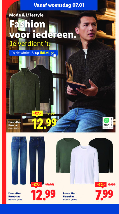 Deze tekst wordt automatisch gegenereerd, dus deze kan fouten bevatten.Vanaf woensdag 07.01 Mode & “he ion dirk ied Bent dt Je verdient ’ts In de winkel & op lidl.nl Q, NY ) Le m | | re Esm: Maten: „act a wenkten En Ill EE = Esmara Men Esmara Men erenjeans 12 99 Herenshirt 99