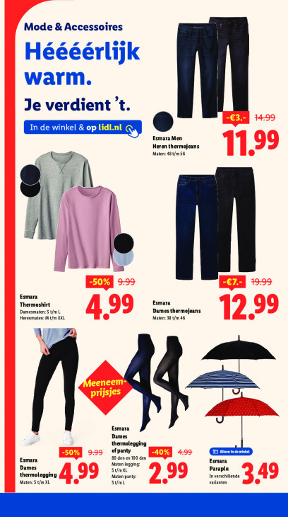 Deze tekst wordt automatisch gegenereerd, dus deze kan fouten bevatten.Mode & Accessoires Héééérlijk warm. Je verdient 't. = Esmara Men Heren thermojeans Pr Maten: 48 t/m 56 à ? s ! = Esmara Thermoshirt Esmara Damesmaten: S t/m L Dames thermojeans Herenmaten: M t/m XXL Maten: 38 t/m 46 A 75 \ Esmara Dames thermolegging of panty LOL 80 den en 100 den Esmara Maten legging: Esmara Dames St/mXL Paraplu thermolegging Maten panty: In verschillende Maten: S t/m XL St/mL varianten