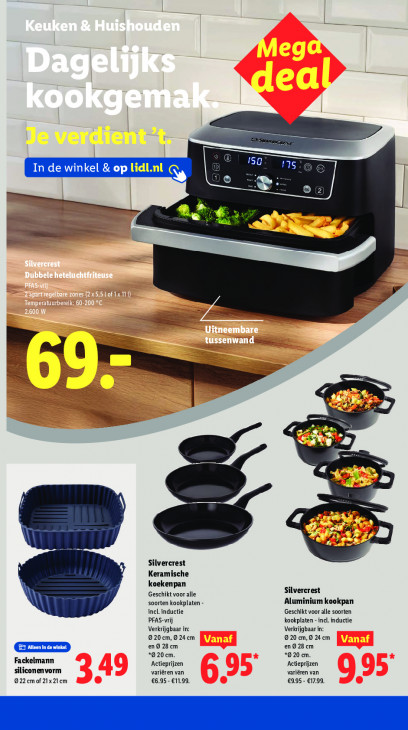 Deze tekst wordt automatisch gegenereerd, dus deze kan fouten bevatten.159 15 < In de winkel & op lidl.nl Se lW a D. cn, Tr ad € ER 0 ME = Pr ij 2 Silvercrest Keramische koekenpan Silvercrest Geschikt voor alle soorten kookplaten - Aluminium kookpan incl. inductie Geschikt voor alle soorten PFAS-vrij kookplaten - incl. inductie Verkrijgbaar in: Verkrijgbaar in: 920 cm, © 24 cm 920 cm,9 24cm en 9 28 cm en 9 28 cm ES *920 cm. *9 20 cm. Fackelmann Actieprijzen Actieprijzen siliconenvorm variëren van variëren van 0 22 em of 21x 21cm €6.95- €11.99. €9,95 - €17.99,