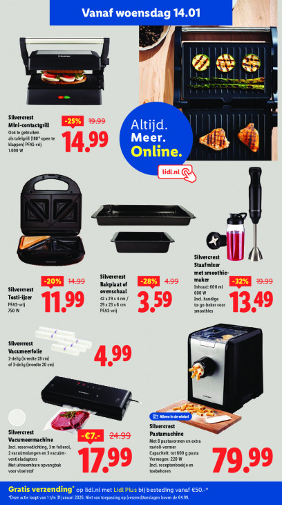 Deze tekst wordt automatisch gegenereerd, dus deze kan fouten bevatten.nn ll je Al ia, B N | te hed x Kn Ad u mw il dm = Silvercrest |] Mini -contactgrill IL Ook te gebruiken N As als tafelgrill (180° open te klappen) PFAS-vrij } 1.000 W 1499 Online. di Silvercrest Staafmixer met smoothie- Silvercrest maker Bakplaat of BEA +» Inhoud: 600 ml Silvercrest ovenschaal 600 W To: ijzer 42x29x4em / Incl. handige PFAS-vrij 29x23x6 cm to-go-beker voor 750 W 1199 PFAS-vrij 329 smoothies 349 Silvercrest Vacumeerfolie %-delig (breedte 28 cm) 99 of 3-delig (breedte 20 cm) \ Se ÿ. ER Silvercrest Silvercrest Pastamachine Vacumeermachine 2499 Met 8 pastavormen en extra Incl. reservedichting, 3m folierol, ravioli-vormer 2 vacuümslangen en 3 vacuüm- Capaciteit tot 600 g pasta ventieladapters Vermogen: 220 W Met uitneembare opvangbak Incl. receptenboekje en voor vloeistof 9 toebehoren 9,99 Gratis verzending’ Lidl Plus
