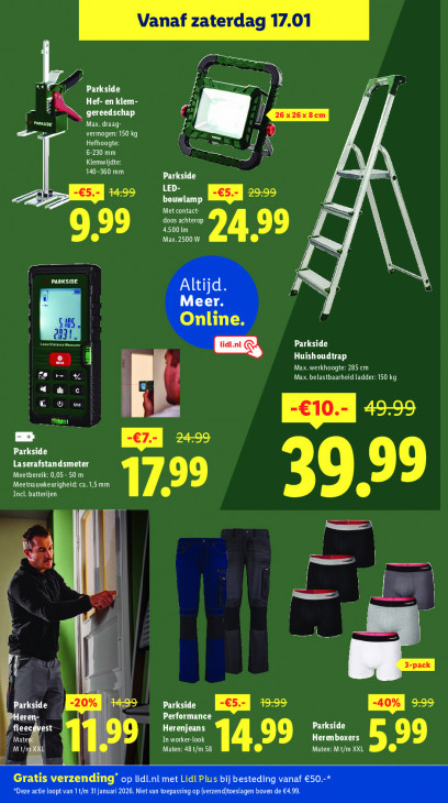 Deze tekst wordt automatisch gegenereerd, dus deze kan fouten bevatten.Vanaf zaterdag 17.01 En £ | Le Hef- en klem- gereedschap cl LL ETS Max. draag- Pr vermogen: 150 kg 4 Hefhoogte: nn on 6-230 mm > a: Klemwijdte: md 140-360 mm Parkside N LED- bouwlamp Les. EEE Met contact- doos achterop 4.500 Im 99 x LEE pl & 2 PARKSIDE mc en Parkside Huishoudtrap mi Max. werkhoogte: 285 cm EI = % Max. belastbaarheid ladder: 150 kg u CC] 14 Bi En «> Parkside er Laserafstandsmeter Meetbereik: 0,05 - 50 m 99 Meetnauwkeurigheïd: ca.1,5mm EL Incl. batterijen En u BL Parkside Parkside Performance Herenjeans Parkside UE (al LES | In worker-Look Herenboxers 99 DEL Maten: 48 t/m 58 14,99 Maten: M t/m XXL 5.39 ï il