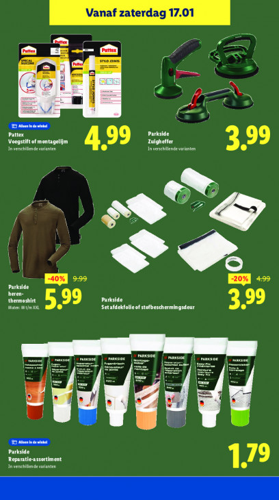 Deze tekst wordt automatisch gegenereerd, dus deze kan fouten bevatten.Vanaf zaterdag 17.01 ass CAL A a ( 0 a _ et N = Bi = es ‚Nor os —\ Pattex Parkside Voegstift of montagelijm EL Zuigheffer In verschillende varianten In verschillende varianten ( — A 2 2 ® 7 | ® “ [20% +> Parkside heren- thermoshirt Parkside LE Maten: M t/m XXL 5,99 Set afdekfolie of stofbeschermingsdeur RENS Beer ETES | montage PARKSIDE PARKSIDE [rs vn ur C2) ferne De ens ban Ed Ed ES I LL Parkside Reparatie-assortiment LE In verschillende varianten