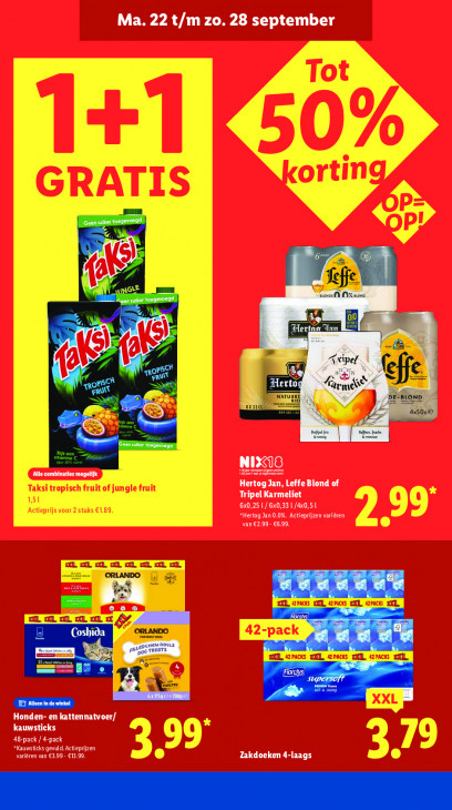 Deze tekst wordt automatisch gegenereerd, dus deze kan fouten bevatten.Ma. 22 t/m zo. 28 september MS A A K en SA Æ = 5 NA ie Rz a x A NIXIC D ERA Alle combinaties mogeliik DES Hertog Jan, Leffe Blond of Tripel Karmeliet 6x0,25 1/6x0,33 1/4x0,51 *Hertog Jan 0.0%. Actieprijzen variören CRT zKL zul oil el ul rl. ml oa aL mene cn aL, En = Honden- en kattennatvoer/ kauwsticks 48-pack / 4-pack *Kauwsticks gevuld.Actieprüjzen variëren van €3.99 - €13.99. Zakdoeken 4-laags