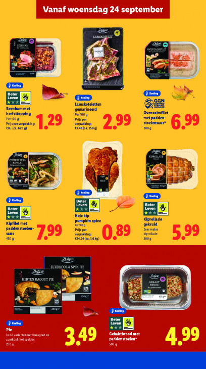 Deze tekst wordt automatisch gegenereerd, dus deze kan fouten bevatten.Vanaf woensdag 24 september fs” A IF Ds wf KeS nd Bm. - Be: GGN Lamskoteletten FREINS Beenhammet gemarineerd herfsttopping Per 100 g Ovenzalmfilet met padden- Per100 g Prijs per stoelensaus* Prijs per verpakking: verpakking: €8.- (ca.620 g) €748 (ca. 250 9) 3009 fi ” ir jp 13 = Pe Hele kip pumpkin spice Kiprollade Kipfilet met Per 100 g gekruid paddenstoelen- Zeer malse saus Prijs per verpakking: Kiprollade 450 g €14.24 (ca.1,6 kg) 500g — nt |} Fe | fl Pie In de varianten hertenragout en Gehaktbrood met zuurkool met spekjes paddenstoelen* ET 500 g