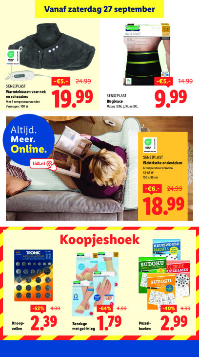 Deze tekst wordt automatisch gegenereerd, dus deze kan fouten bevatten.Vanaf zaterdag 27 september RACE G E = SENSIPLAST Warmtekussen voor nek en schouders SENSIPLAST Met 6 temperatuurstanden Rugbrace Vermogen: 100 W Maten: S/M, L/XL en XXL Altijd. Meer. mn, Online. SENSIPLAST Fr Elektrische onderdeken j 6 temperatuursstanden 55-65W 150 x 80 cm I m pra :tepe ORD. TRONIC RAAD: ED ET oKU 0 o = un ee" 8.8 8 © 5 9 } Knoop. Bandage Puzzel- cellen met gel-inleg boeken