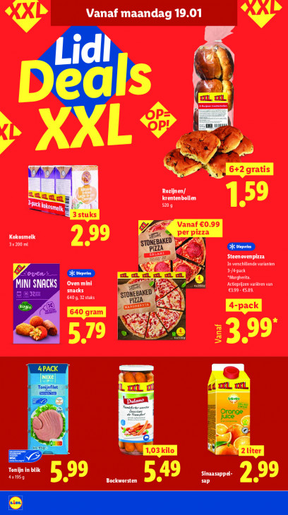 Deze tekst wordt automatisch gegenereerd, dus deze kan fouten bevatten.Vanaf maandag 19.01 a A VOL. KL, P & ant 7 6+2 gratis Rozimen/ EL où krentenbollen 159 LT CU 3stuks Vanaf €0.99 % EEE: per pizza Kokosmelk 3x 200 ml 2 99 > Q In verschillende varianten Steenovenpizza KE an 2 X ol ai. Su GL DL 4 3-/4-pack Margherita Oven mini Actieprijzen variëren van snacks 5 €3.99- €5,89, 640 g, 32 stuks ns à 5 x A 579 ge Vanaf 3.99 ad XL OL La SF N HH? Be 1,03 kilo 2 liter Tonijn in blik 4x195g 5 99 Bockworsten LCR mu 2,99