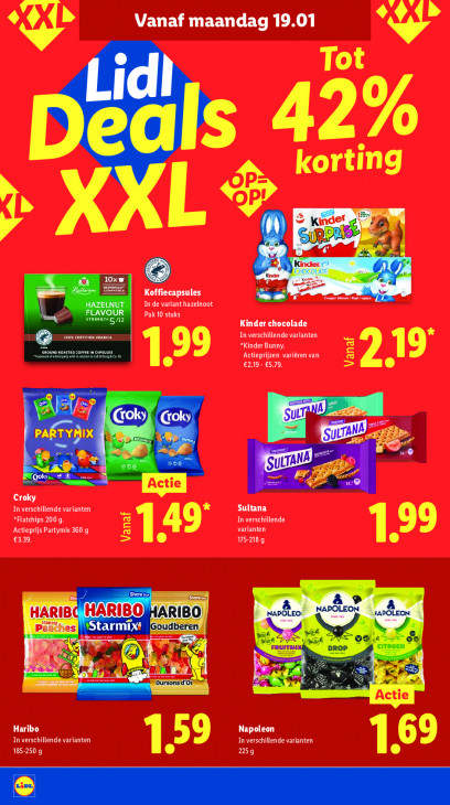 Deze tekst wordt automatisch gegenereerd, dus deze kan fouten bevatten.+04b Vanaf maandag 19.01 Tot VN korting Re inde! inder. Koffiecapsules SE rn In de variant hazelnoot a 4 Pak 10 stuks Kinder chocolade In verschillende varianten *Kinder Bunny. Actieprijzen variören van 1,99 €2.19 - €5.79. É 219 Fa Me zur bss Te Ee à Actie Croky In verschillende varianten Sultana *Flatchips 200 g. In verschillende Actieprijs Partymix 360 9 49 varianten EL €339. Vanaf 175-218 9 HARIBCHARIBO Harp es VN 0 VN m Me, me, “5 Actie Haribo Napoleon In verschillende varianten ‘In verschillende varianten 185-250 g 1.59 ET) 1,69 Ea