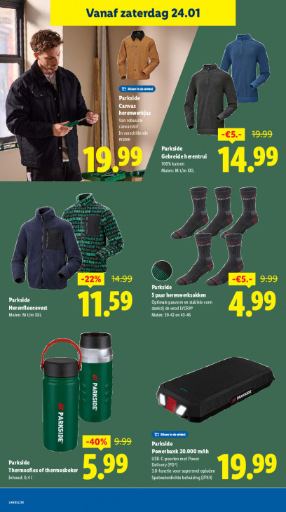 Deze tekst wordt automatisch gegenereerd, dus deze kan fouten bevatten.Vanaf zaterdag 24.01 mn \ À e— D D A U) il el pe 555 ER Parkside CET OUT ELU à 100% katoen 99 Maten: Mt/m XXL { | en ) ER on ES Hl Cor ) EN DE 1 Li N avt } 4 ET l W Aside 5 i Ea += es Kad Parkside — 5 paar herenwerksokken Parkside Optimale pasvorm en stabiele vom Herenfleecevest 59 dankaij de vezel LYCRA® 99 Maten: Mt/m XXL Maten: 39-42 en 43-46 al Zn ij W ri F4 J „AUISHUVd Parkside 0% Ks Powerbank 20.000 mAh Parkside Delivery (PD*) AOL Thermosfles of thermosbeker 3.0-functie voor supersnel opladen Inhoud: 0,41 LE 19.39 Spatwaterdichte behuizing (IPX4) nn