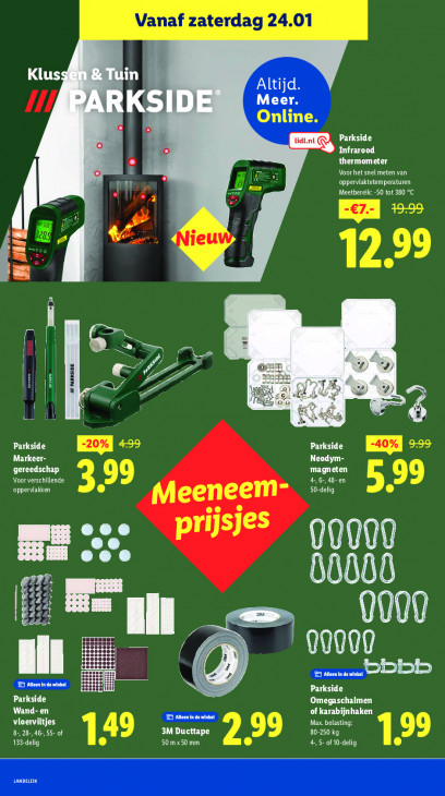 Deze tekst wordt automatisch gegenereerd, dus deze kan fouten bevatten.Vanaf zaterdag 24.01 Klus A ın Altijd mp RKSID Meer. Online. lidlnt Parkside A Infrarood thermometer Voor het snel meten van Ex I) ce opperviaktetemperaturen Meetbereik: -50 tot 380 °C pr Ei > [G #2. i eu EL I td es 07 Ha SE. Do d) a X 950 x x 2 oa é Parkside Parkside -40% Markeer- Neodym gereedschap magneten Voor verschillende 4,6: 48-en DATE EX} 50-delig CH 41 ZI 10 Ed ir prijsjes 00000 = En .. PEL Wii tr am (int LT +. Ses rer) } LI F3 Alleen in de winkel bbbb LTE Bi LI OT Parkside = Omegaschalmen Wand- en of karabijnhaken vloerviltjes Le LU LT CARTES 8, 28-,46-,55- of 3M Ducttape EE 133-delig Et 50 m x 50 mm XL 4, 5- of 10-delig 199 NCD