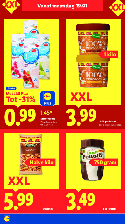 Deze tekst wordt automatisch gegenereerd, dus deze kan fouten bevatten.Vanaf maandag 19.01 wi > À ANCIEN = Im KA KL, U à > mie À | \ | Ss PINDAKAAS me vene Drinkyoghurt DE NU 100% pindakaas van €1.28 - €1,45. Met of zonder stukjes pinda KIL, xxl, KIL Walnu x Le ke Walnoten Duo Penotti