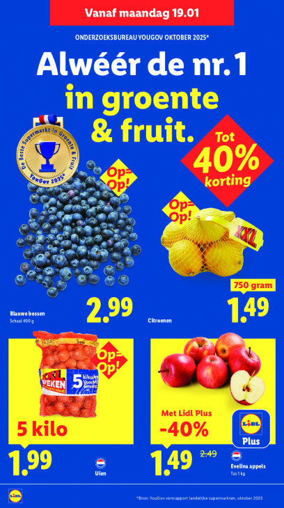 Deze tekst wordt automatisch gegenereerd, dus deze kan fouten bevatten.Vanaf maandag 19.01 ONDERZOEKSBUREAU YOUGOV OKTOBER 2025* Alwéér de nr. 1 in groente x 76, ET N2, & fruit. Tot T LE @ EO 40% uGov 197 + 5 korting en 9 EN & PR. ET. à + JP & 2 ee PTT DI al ne IP EM LAC , 5 2) OE ee ver ID ij NN N Net a LE PCR a 7e +: Et. 4% ts Ral i® kt 2 @ %) 5 @ ® MC) Blauwebessen Schaal 400 g 299 Citroenen 149 RS Wi a N: en 5 Km Met Lidl Plus 5 kilo -40% Plus e EL Uien 149 ” Tas1 kg Evelina appels *Bron: YouGov versrapport landelijke supermarkten, oktober 2025