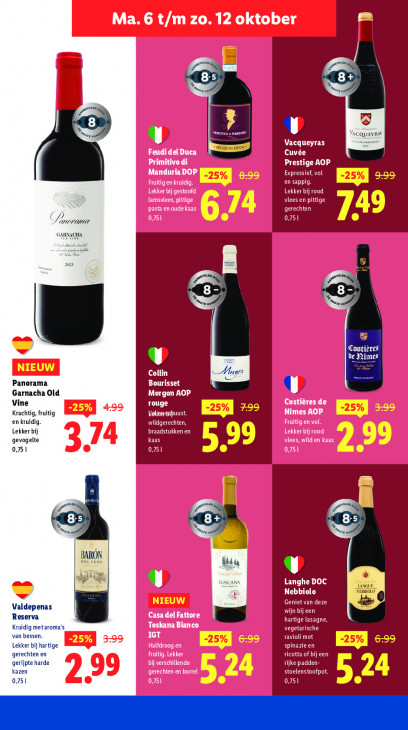 Deze tekst wordt automatisch gegenereerd, dus deze kan fouten bevatten.Ma. 6 t/m zo. 12 oktober geeen, cn 8+ oran More Pe Ce ' ore QUEVRA Vacqueyras ie -FBUDI se DUA, Feudi del Duca Cuvée Primitivo di Pre: 5 je AOP ManduriaDOP Expressief, vol Fruitigen kruidi EI] «>» en sappig. Lekker bijgestoofd Lekker bij rood lamsulees, pittige IUT pasta en oudekaas gerechten 49 0,75! CZ Lnerama 0,751 6.74 GARNAGHA zon > Kuis ded L Lans Collin Panorama Bourisset Garnacha Old ' Morgon AOP Vine rouge Costières de Nimes AOP Krachtig, fruitig EZ + PCT 25% E23 en kruidig. ME Fruitig en vol. Lekker bij braadstukken en Lekker bij rood. gevogelte kaas 9 9 vlees, wilden kaas 0,751 3.74 0,751 LU 0,751 299 - Po . 5 "one ror w BARÓN El pan 4 man Langhe DOC Nebbiolo +” u NIEUW CET ES Valdepenas wijn bij een Reserva Casa del Fattore hartige lasagne, Kruidig metaroma's Toskana Bianco vegetarische van bessen. IGT ravioli met Lekker bij hartige ET EU spinazie en 25% RS gerechten en frutig. Lekker ricotta of bij een gerijpte harde bi werschillende rijke padden- kazen PET stoelenstoofpot. 0,751 299 0,751 5.24 0,751 WA