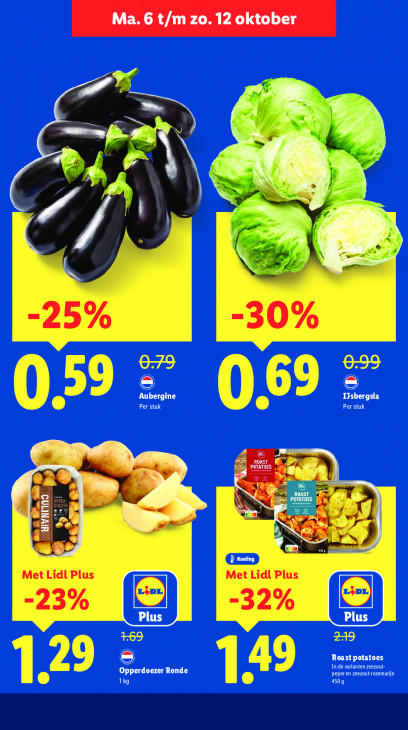 Deze tekst wordt automatisch gegenereerd, dus deze kan fouten bevatten.Ma. 6 t/m zo. 12 oktober A uf à Ron; € e 6 “4 NS A -30% ei 8 So A 59 Aubergine HE IJsbergsla Per stuk Per stuk 2. A à ME A 4 ee 27 | nn MB 2 (Et Met Lidl Plus Met Lidl Plus © -23% -32% Plus Roast potatoes Oedse Ronde 49 129 : 1kg pe 450g t-rozemari